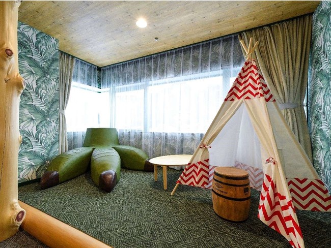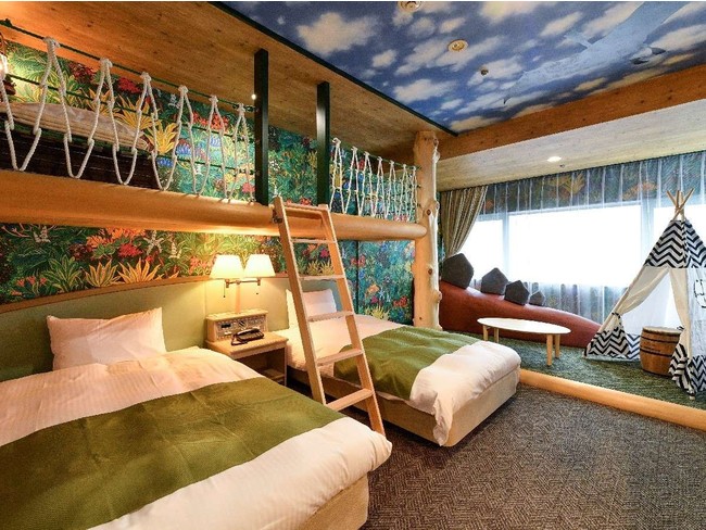 恐竜ルームは壁一面に大きな恐竜がお出迎え!カラフルで異世界に迷い込んだようなワクワク感が広がります。隅々まで恐竜がいっぱいで、子連れ旅行にぴったりの内装となっています。